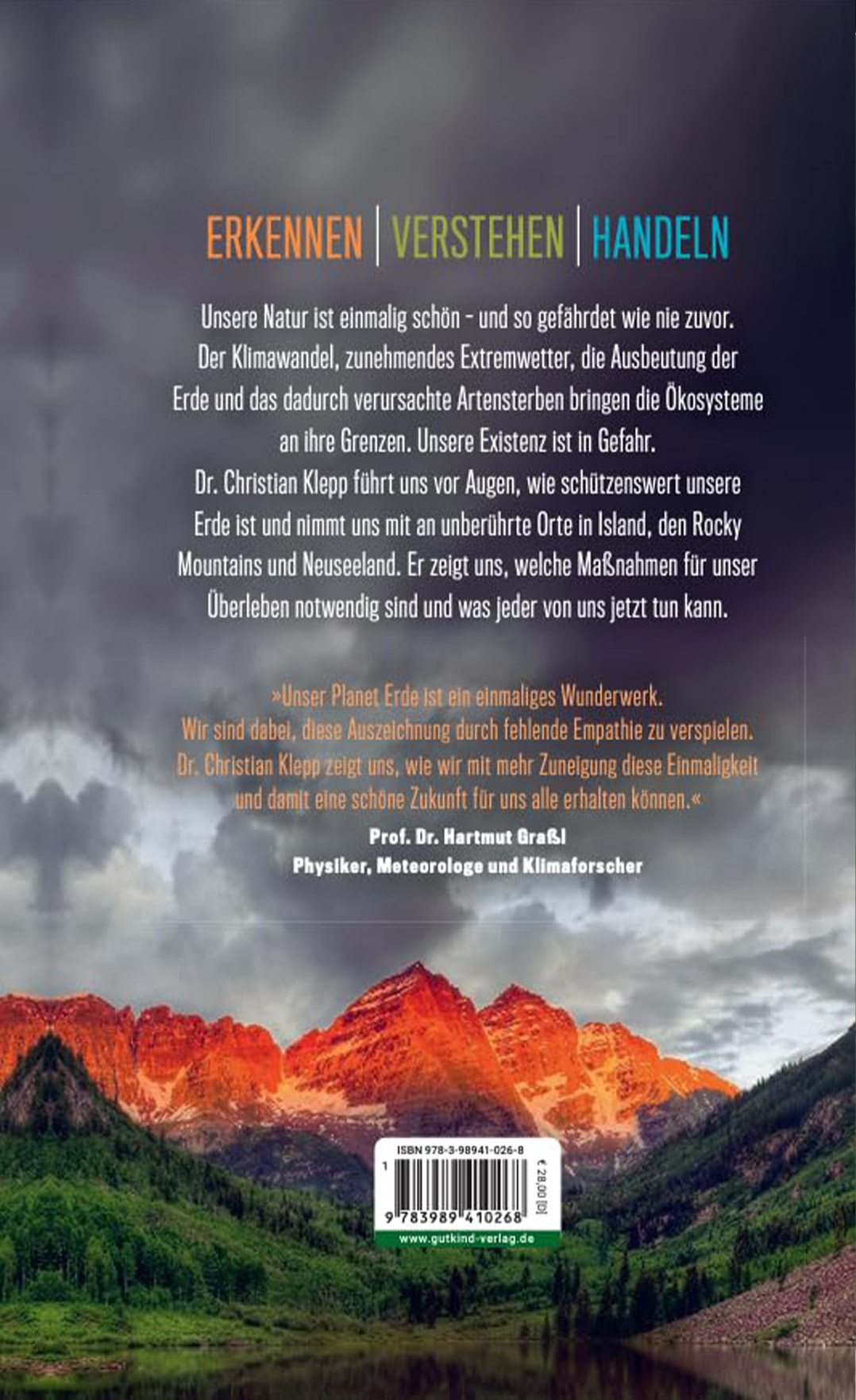 Unsere Natur ist wunderschön und einmalig – doch sie ist gefährdeter als je zuvor. Extremwetter wie Hitzewellen, zerstörerische Stürme und Überschwemmungen bedrohen nicht nur unsere Umwelt, sondern auch unser tägliches Leben. In seinem neuen Buch nimmt uns SPIEGEL-Bestsellerautor Dr. Christian Klepp mit auf seine Reisen zu unberührten Orten auf Island, in den Rocky Mountains und Neuseeland. Er zeigt eindrücklich, wie der Klimawandel die Natur verändert – und warum wir ihn nicht nur als Bedrohung, sondern auch als Chance und Aufbruch in eine nachhaltige Zukunft begreifen können. Er appelliert an unsere Werte wie Liebe, Respekt und Achtsamkeit und fordert uns auf, nicht in Angst und Frustration zu verfallen.